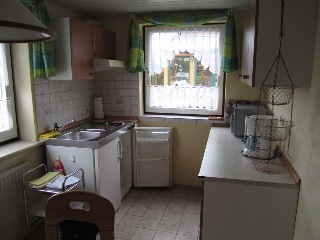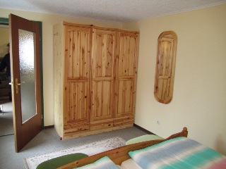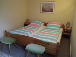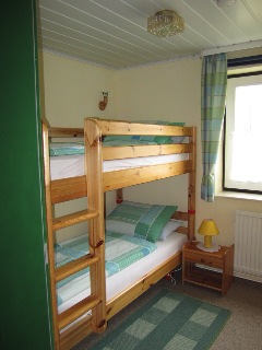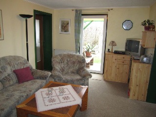 Duschbad, zwei Schlafzimmer mit je zwei Betten (Doppelbett, Etagenbett). Alle Möbel sind überwiegend in Kiefer gehalten. Das Wohnzimmer mit digitalem SAT- TV und tragbarem CD/ Radio – Player ist mit der Essküche verbunden.