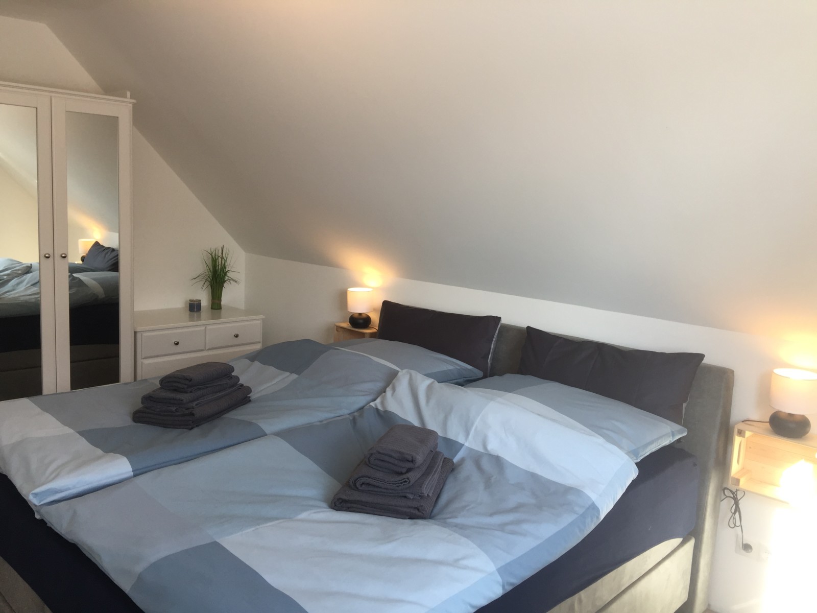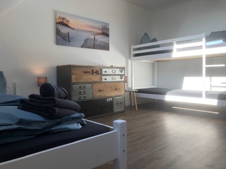 Es gibt ein Dreibettzimmer mit Etagenbett und zwei Doppelbettzimmer, eines davon mit Boxspringbett.