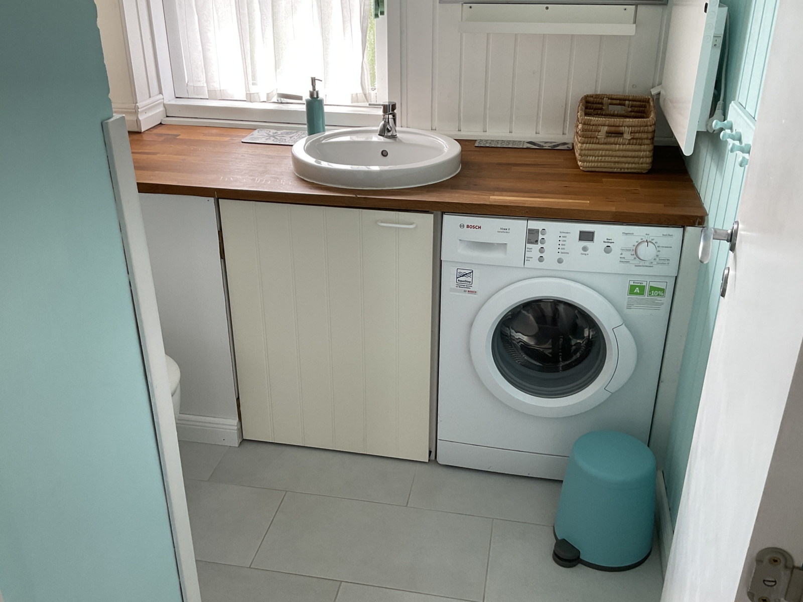 - Badezimmer mit Waschbecken, Dusche, Waschmaschine und WC