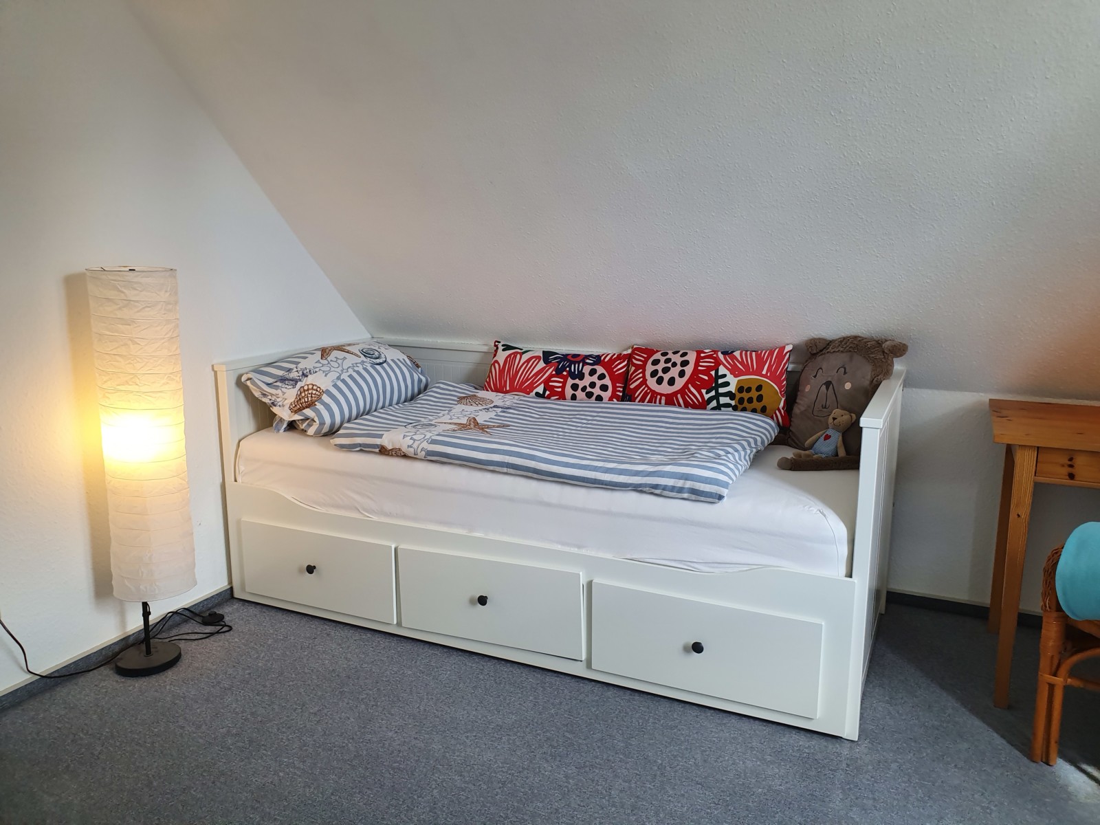 Das Haus befindet sich in ruhiger Lage – hier ist das Spielen der Kinder auf der Straße noch möglich. Ein paar Schritte entfernt befindet sich ein Kinderspielplatz zum ausgiebigen Toben. Der Strand ist zu Fuß oder mit dem Fahrrad schnell erreicht.