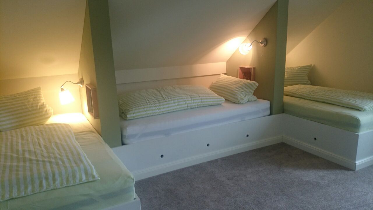 Im Dachgeschoss befindet sich ein zweites Duschbad, so dass es nicht zum Stau kommt. Sie wollen sich ja bei uns erholen. Das Kinderzimmer verfügt über 3 Betten in urgemütlichen Bettkojen. Platz zum Spielen bleibt auch hier. Das Kinderbett und die Wickelkommode befinden sich im angrenzenden Elternschlafzimmer. Von hier aus gelangen Sie auf den Balkon, der am Abend dazu verführt, bei einem Glas Wein den Sonnenuntergang und die Ostsee zu bestaunen.