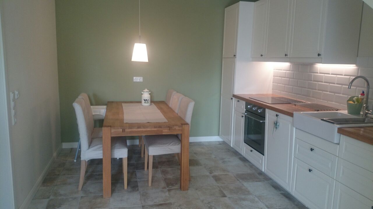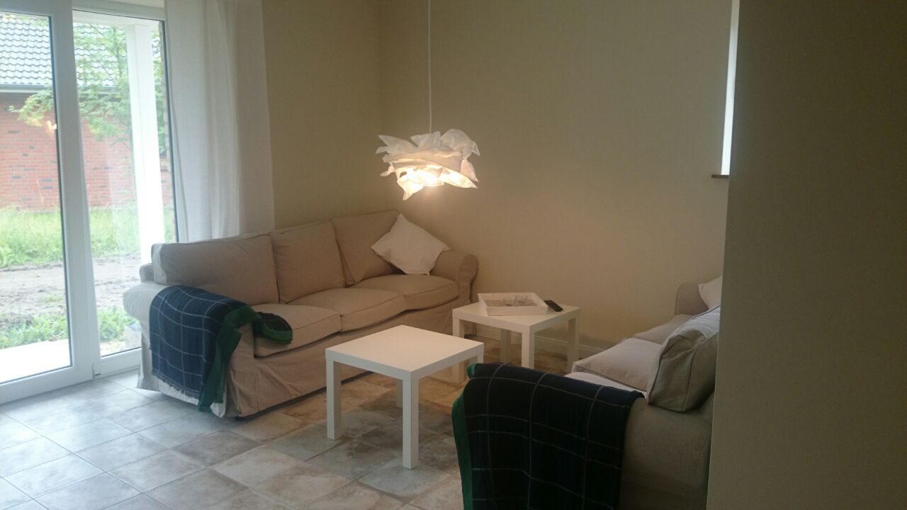 Im Erdgeschoss des stilvoll ausgestatteten 5 Sterne Landhauses befindet sich ein Duschbad und ein großer Bereich zum Kochen, Essen und Wohnen. Die Küche ist ausgestattet mit einem Ceranfeld (Induction), Backofen, Kühlschrank mit Gefrierfach und Geschirrspüler. Ein Tisch für 6 Personen lädt ein, um gemeinsam zu essen und zu spielen. Aus dem Wohnbereich gelangen Sie dann direkt auf die Südwest-Terrasse. Hier können Sie die Sonne genießen oder mit der Familie grillen.
