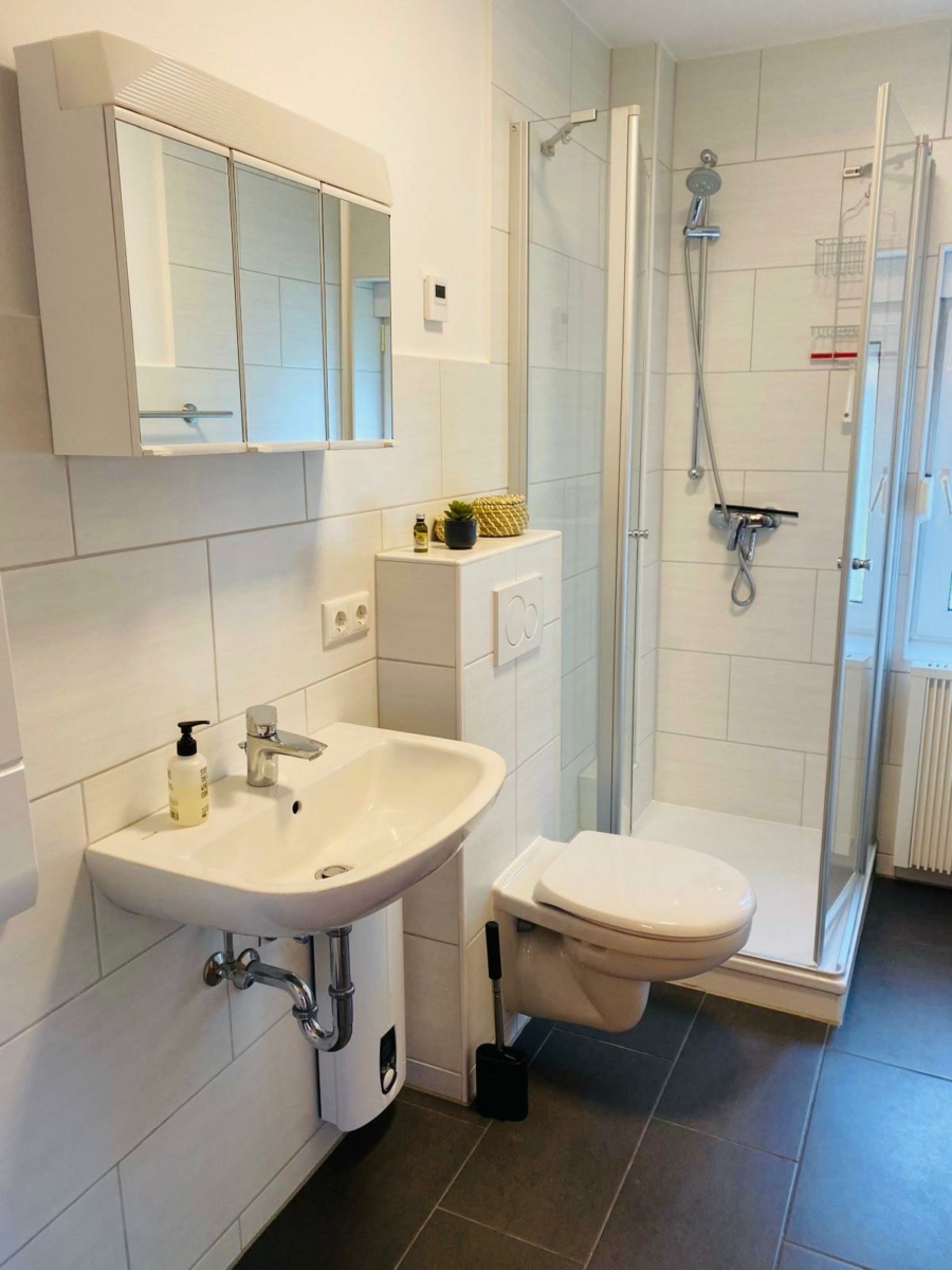 Ein modernes Bad und breite Türen machen die Wohnung auch für Senioren perfekt.