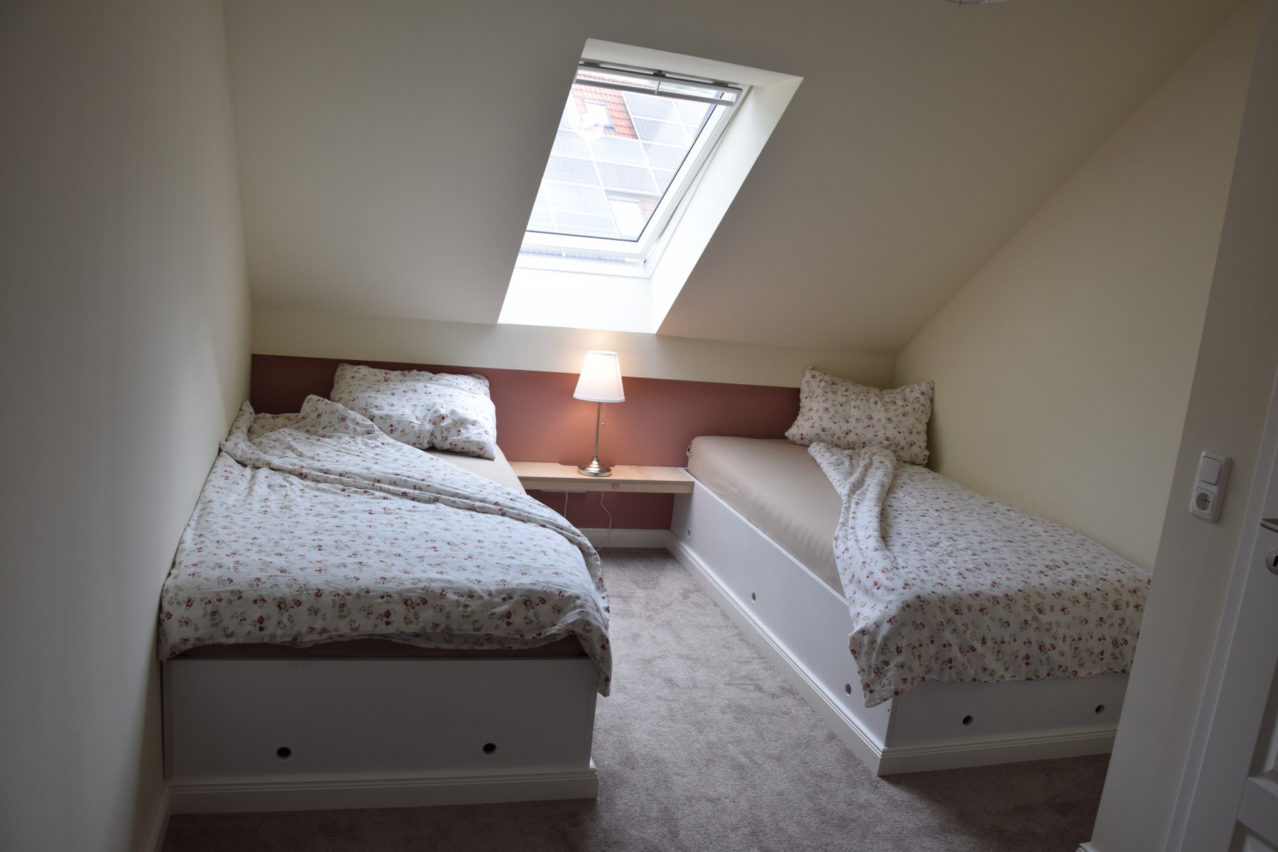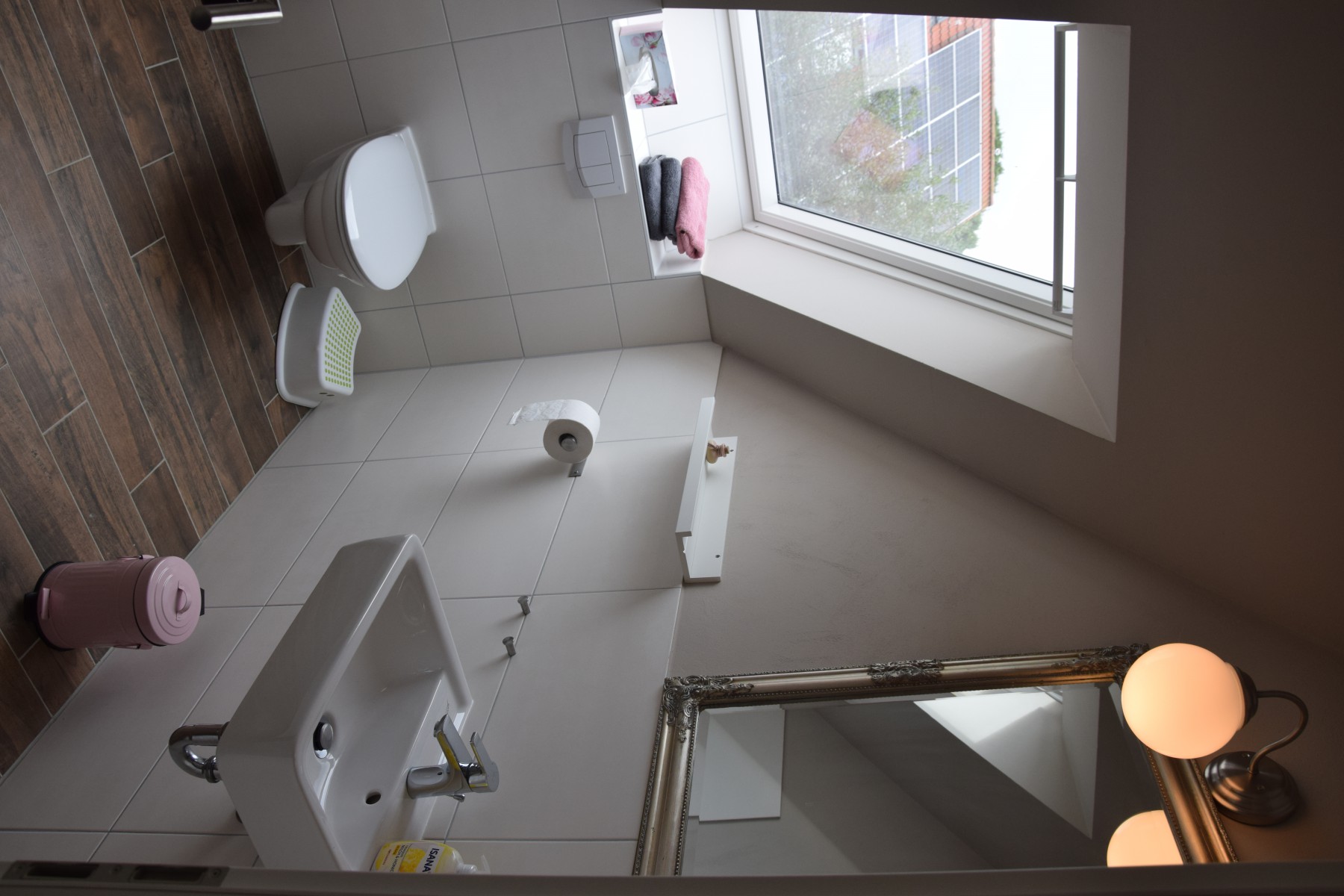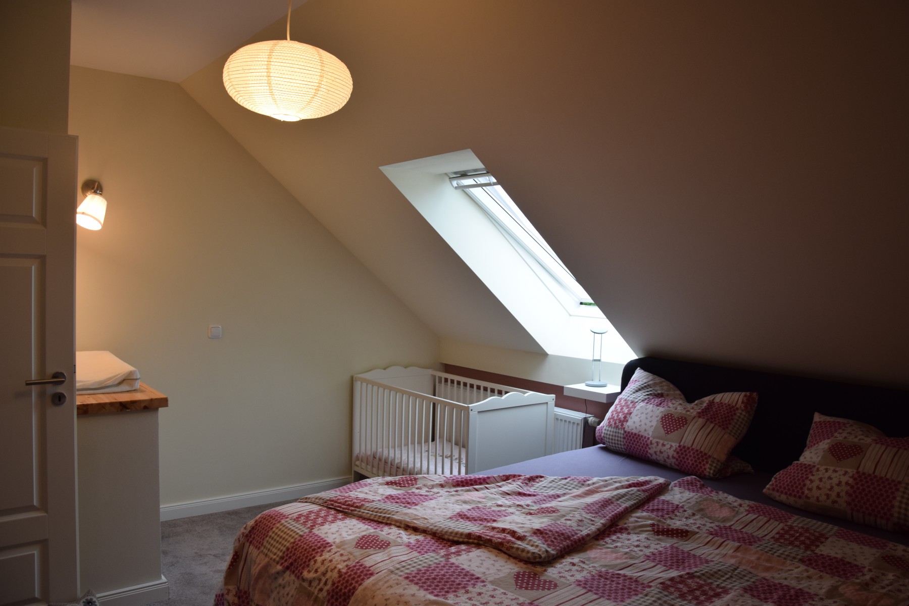Im Obergeschoss gibt es ein zusätzliches WC. Ein Kinderzimmer mit 2 Betten und ein Elternschlafzimmer mit einem Boxspring-Doppelbett, einem Kinderbett und einem Wickeltisch befindet sich ebenfalls in dieser Etage.