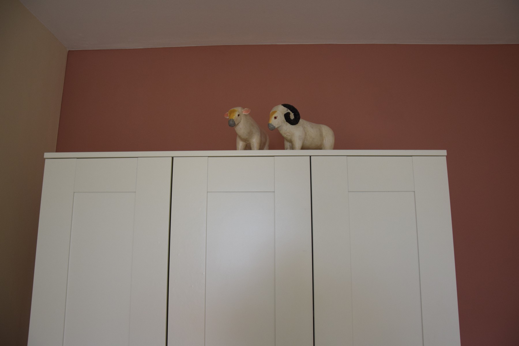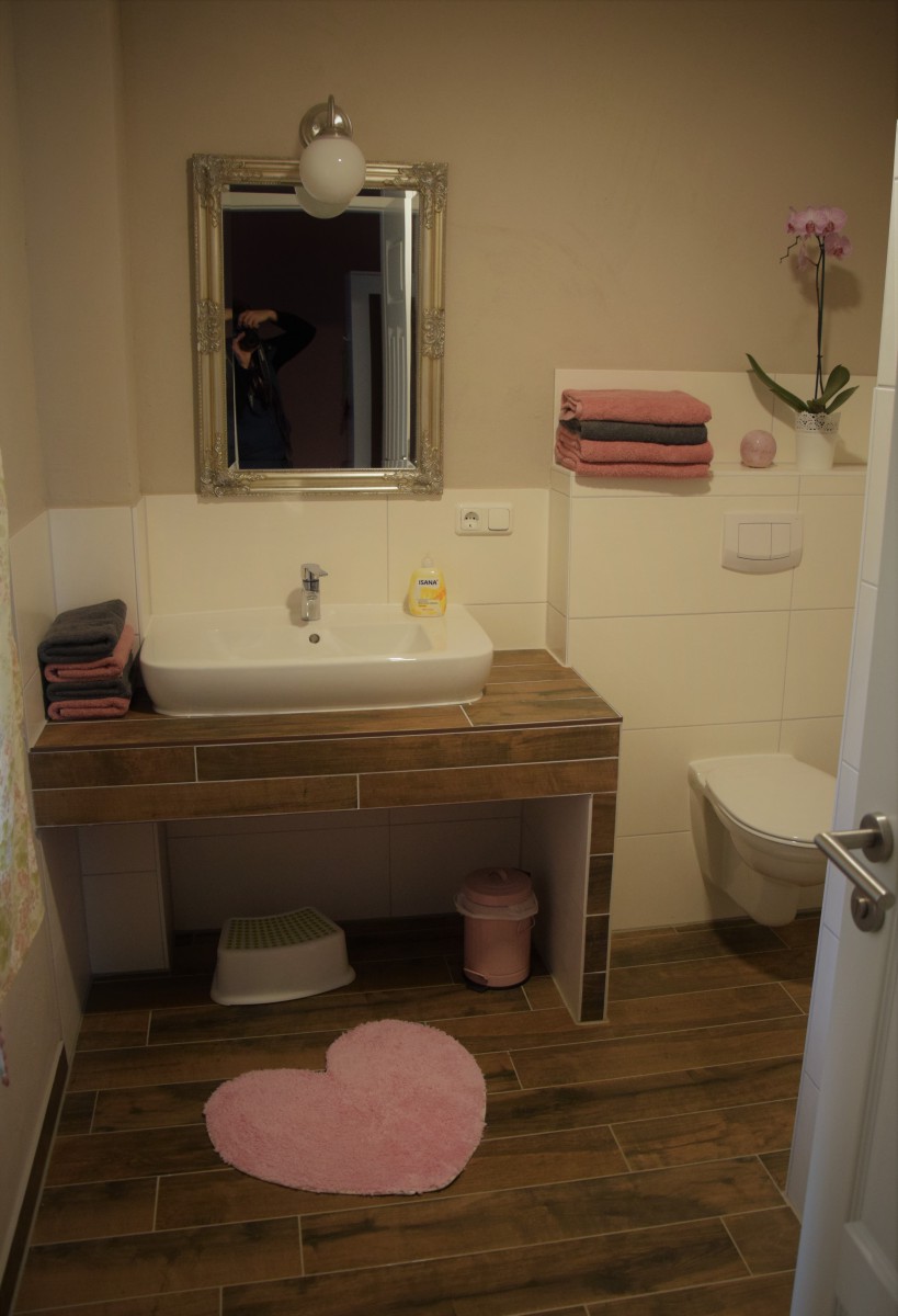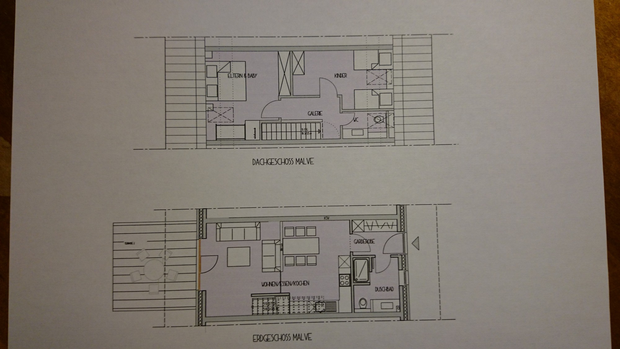 Im Obergeschoss gibt es ein zusätzliches WC. Ein Kinderzimmer mit 2 Betten und ein Elternschlafzimmer mit einem Boxspring-Doppelbett, einem Kinderbett und einem Wickeltisch befindet sich ebenfalls in dieser Etage.
