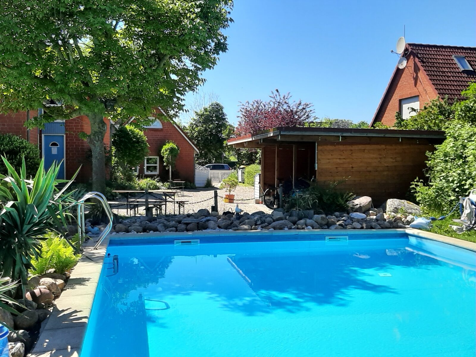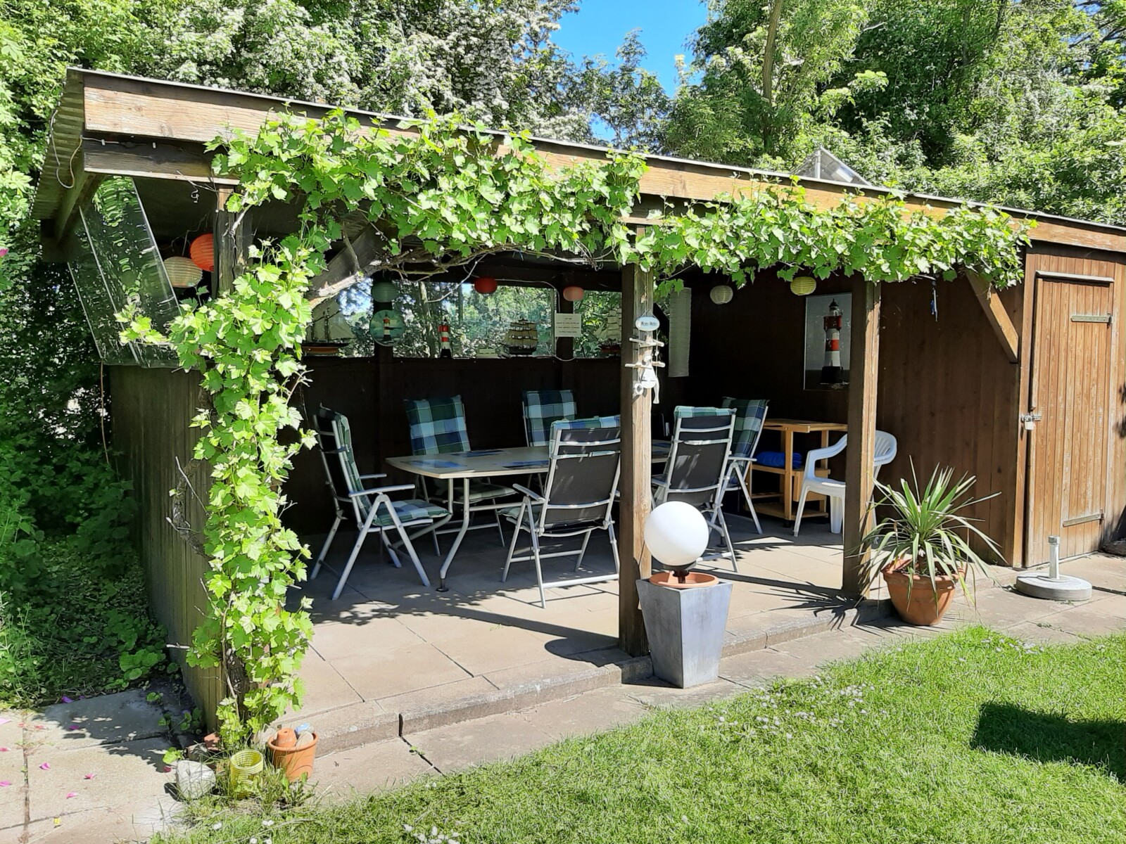 Im Landhaus steht Ihnen die Nutzung des geräumigen Saunabereichs mit separater Dusche und WC frei. Des Weiteren stehen dort Waschmaschine und Trockner zur Verfügung. Der idyllisch im Grünen eingefasste Außenbereich lädt mit Liegen und gemütlichen, teilweise überdachten Sitzgelegenheiten am Grillplatz oder am Lagerfeuer zum Verweilen ein.