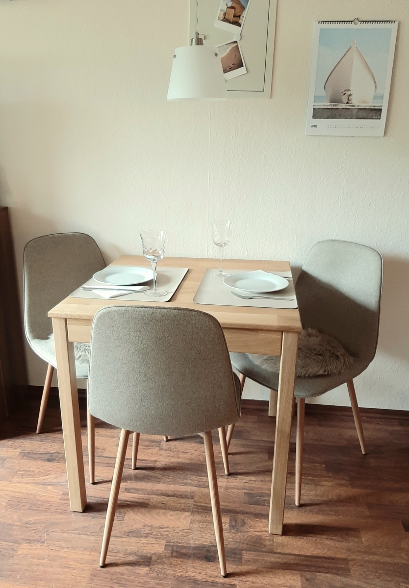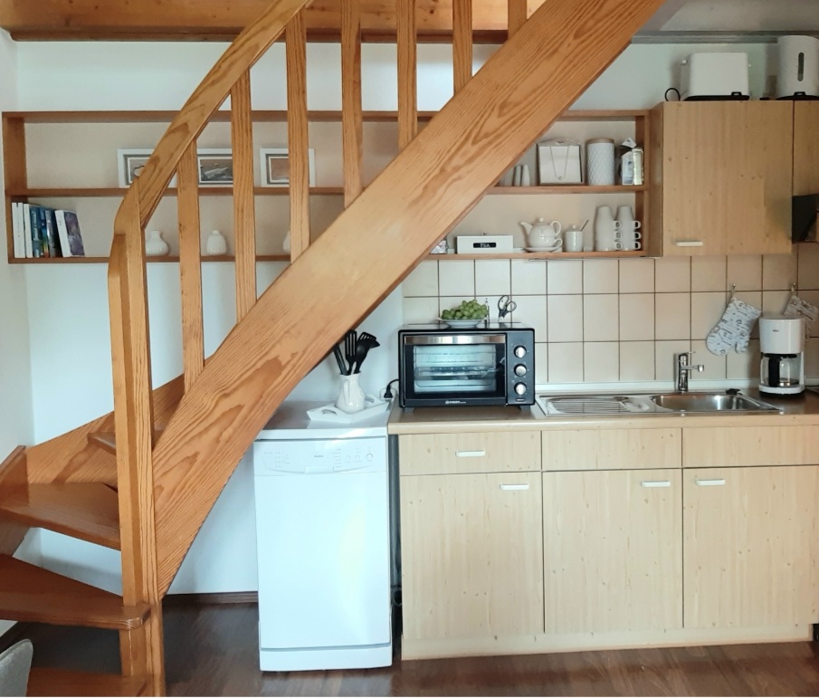 Ausstattung: Wohnzimmer mit Internet-TV und -Radio WLAN Offener Essbereich Küchenzeile mit Mini-Backofen, 2-Platten-Cerankochfeld, Kühlschrank, Geschirrspüler, Kaffeemaschine (Filterkaffee), Wasserkocher, Toaster Tiefkühlschrank Bodenbelag: Laminat Duschbad mit WC und Föhn