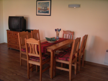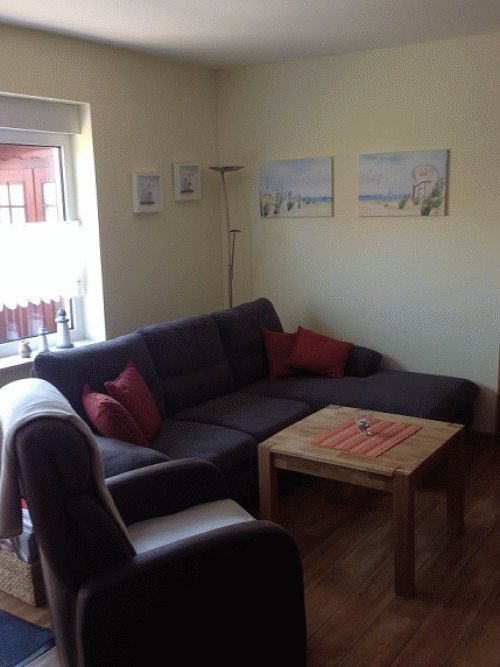 Geräumiges Wohnzimmer mit Flachbildschirm und Sat-Anschluss, DVD Spieler, sowie einen Tragbaren CD-Spieler, die Essecke ist integriert.