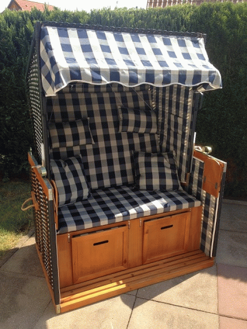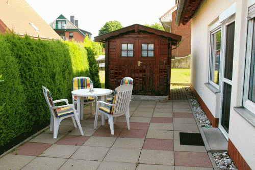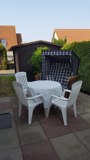 Auf der schönen, mit Lebensbäumchen eingewachsenen Terrasse (ca. 16 m²) können Sie schon morgens das Frühstück im Strandkorb und Sonnenschein genießen.