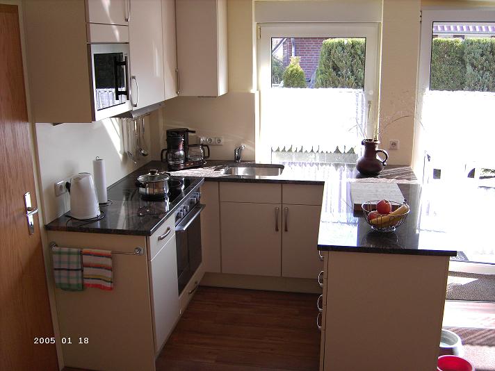 Eine komplett eingerichtete Küche mit Kaffeemaschine, Wasserkocher, Toaster, Eierkochen, Backofen und Geschirrspüler lässt kaum Wünsche offen.