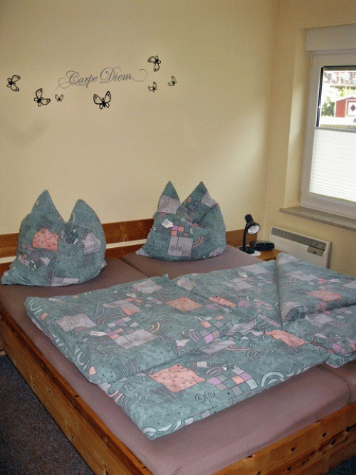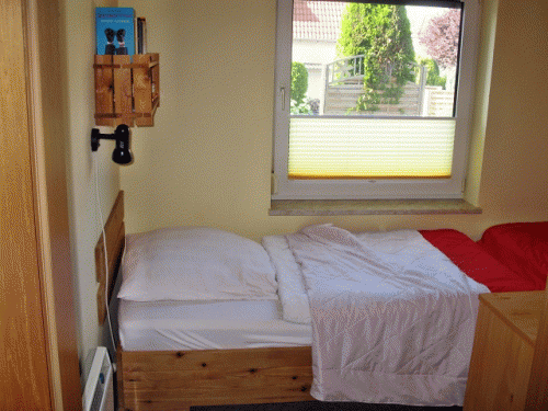 Ein Schlafzimmer mit Doppelbett, das zweite Schlafzimmer mit zwei versetzten Betten (Kinderzimmer).